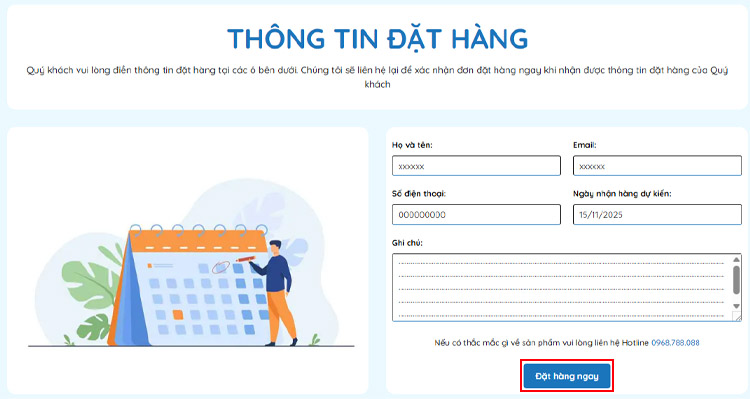Quý khách vui lòng điền đầy đủ thông tin. Lưu ý: Quý khách vui lòng chọn ngày nhận hàng dự kiến cách ít nhất thời điểm đặt hàng 2 ngày. Hãy mô tả chi tiết yêu cầu đặt hàng tại ô "Ghi chú"