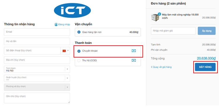 Tiếp theo, quý khách vui lòng điền đầy đủ thông tin và chọn hình thức thanh toán. Tại ô "Thanh toán", do hàng hóa có giá trị cao nên các đơn vị vận chuyển sẽ không hỗ trợ thu hộ COD, nên quý khách vui lòng chọn vào mục "Chuyển khoản". Sau khi điền xong, hãy kiểm tra lại toàn bộ thông tin vừa điền. Sau đó, Bấm vào ô "Đặt hàng"